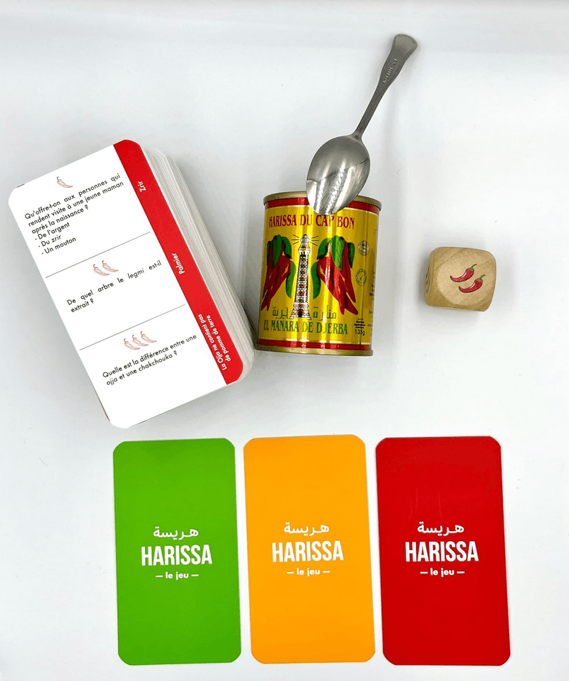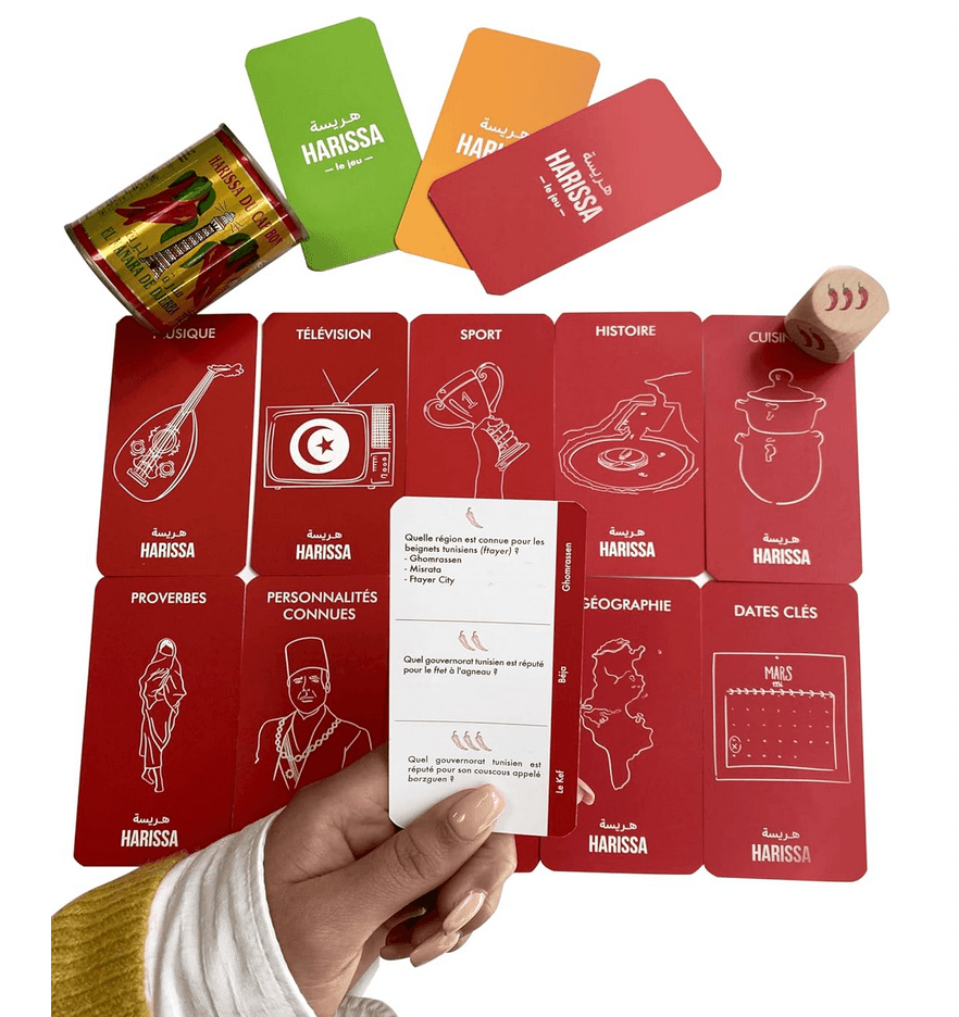 Harissa Le Jeu est le premier jeu de société 100 % tunisien, un quiz de culture générale passionnant entièrement rédigé en derja et disponible aussi en français qui plonge les joueurs au cœur de la Tunisie. Ce défi culturel amusant permet de tester ses connaissances dans diverses catégories et niveaux de difficulté, idéal pour des moments conviviaux en famille avec les ados. Les règles sont simples et ludiques : le gagnant est celui qui répond correctement à la majorité des questions, tandis que le perdant goûtera une cuillère d’harissa, rappel piquant de sa défaite ! Le jeu comprend des cartes questions, un dé et une boîte d’harissa pour apporter une touche d’authenticité tunisienne. Entièrement Made in Tunisia, cette création locale célèbre avec originalité et humour la richesse culturelle du pays.