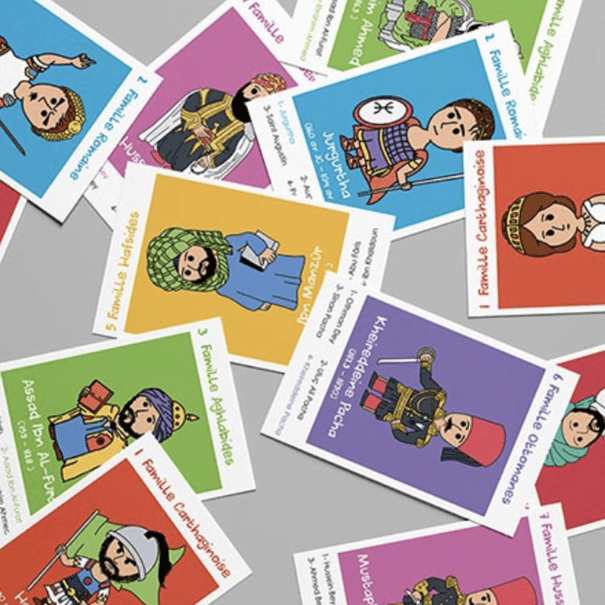 Gloristory est un jeu de cartes éducatif qui met à l’honneur les héros et grandes figures de l’histoire tunisienne. Conçu sous la forme d’un jeu de 7 familles, il invite les enfants à découvrir, à travers des illustrations soignées et des personnages emblématiques, les grandes périodes de l’histoire du pays. Chaque famille représente une dynastie tunisienne, permettant d’aborder les époques majeures de manière ludique et accessible.