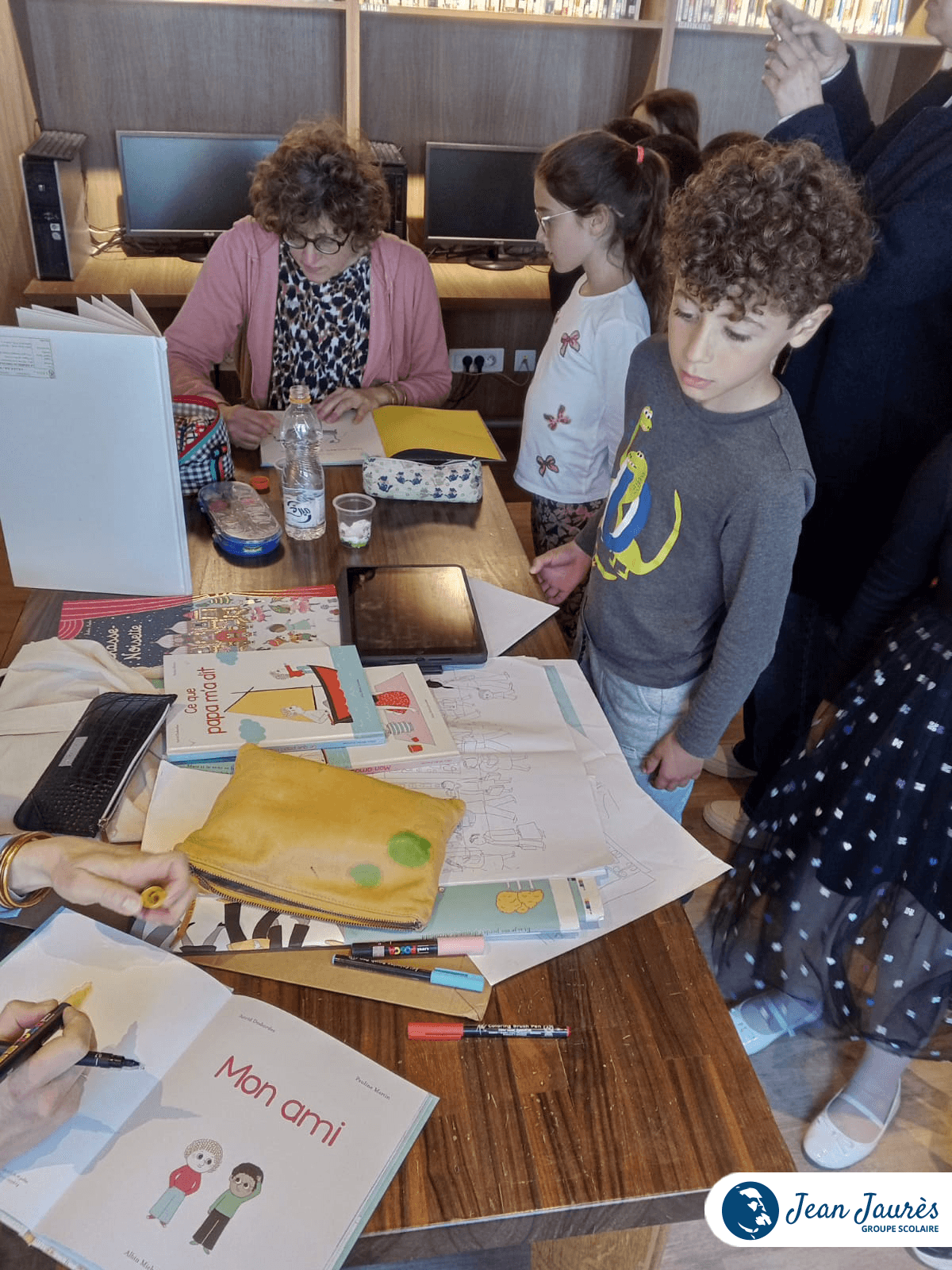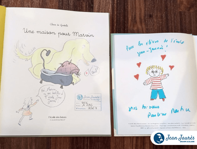 Un grand merci à Marielle Morin de l’Institut français, qui a rendu cette rencontre possible, ainsi qu’à nos deux artistes pour leur générosité. Elles ont en effet offert à la bibliothèque de l’école un album dédicacé ainsi qu’un magnifique croquis réalisé en direct sous les yeux émerveillés des élèves — un souvenir précieux qui continuera d’inspirer petits et grands.