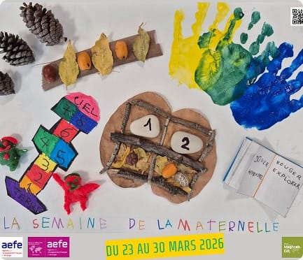 Parce que notre affiche a remporté le concours régional des maternelles, elle illustre la nouvelle édition de « La Semaine de la Maternelle », un événement phare de la zone Maghreb Est qui aura lieu du 23 au 30 mars 2026, organisé par l’AEFE (https://aefe.gouv.fr/fr).